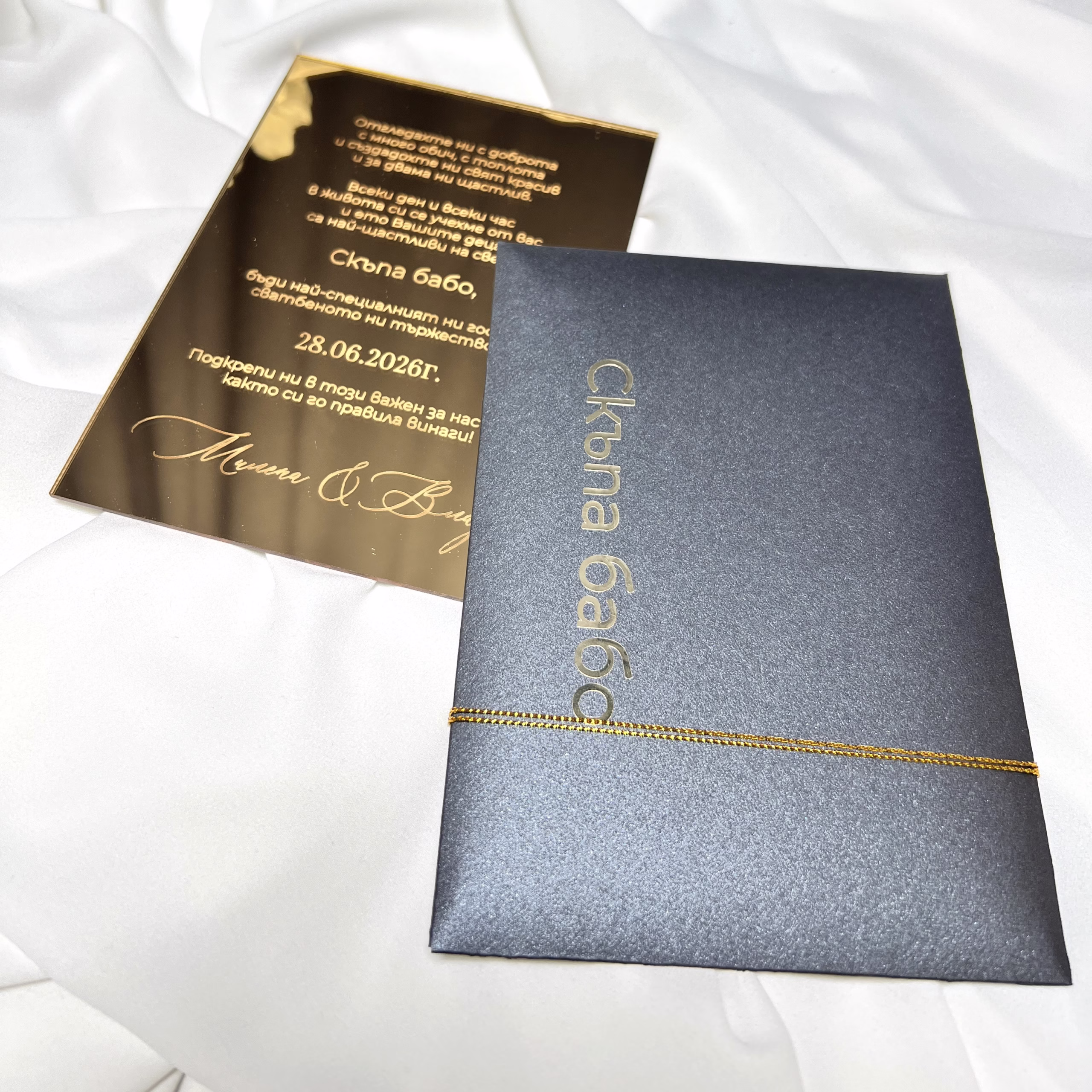 Гравирана златна огледална покана за сватба, създадена за стилни и елегантни тържества. Изработена е от огледален златен плексиглас с 3 мм дебелина и персонален гравиран текст с имена и дата. Луксозен дизайн, подходящ за покана към родители, кумове и най-близките ви хора. Идеален избор за модерна и запомняща се сватбена покана.