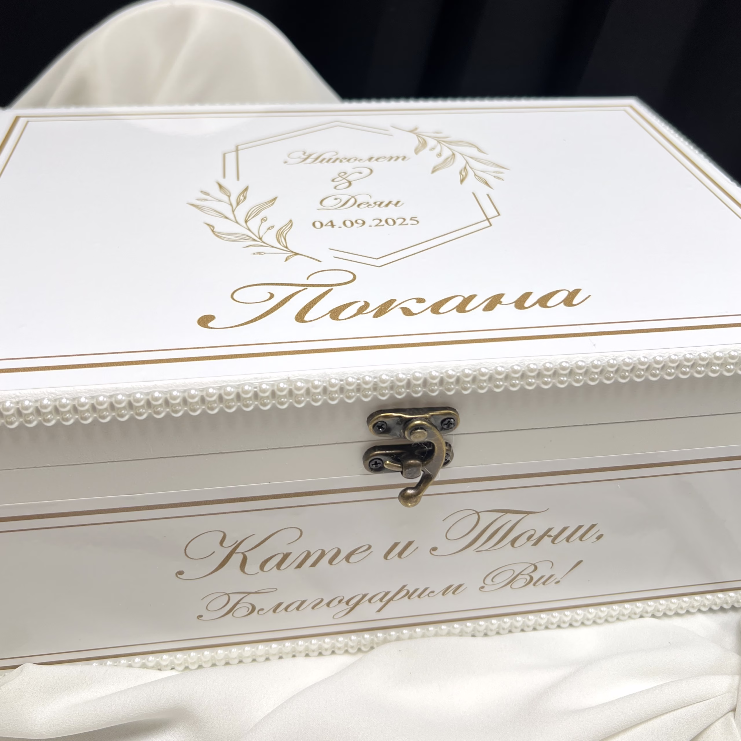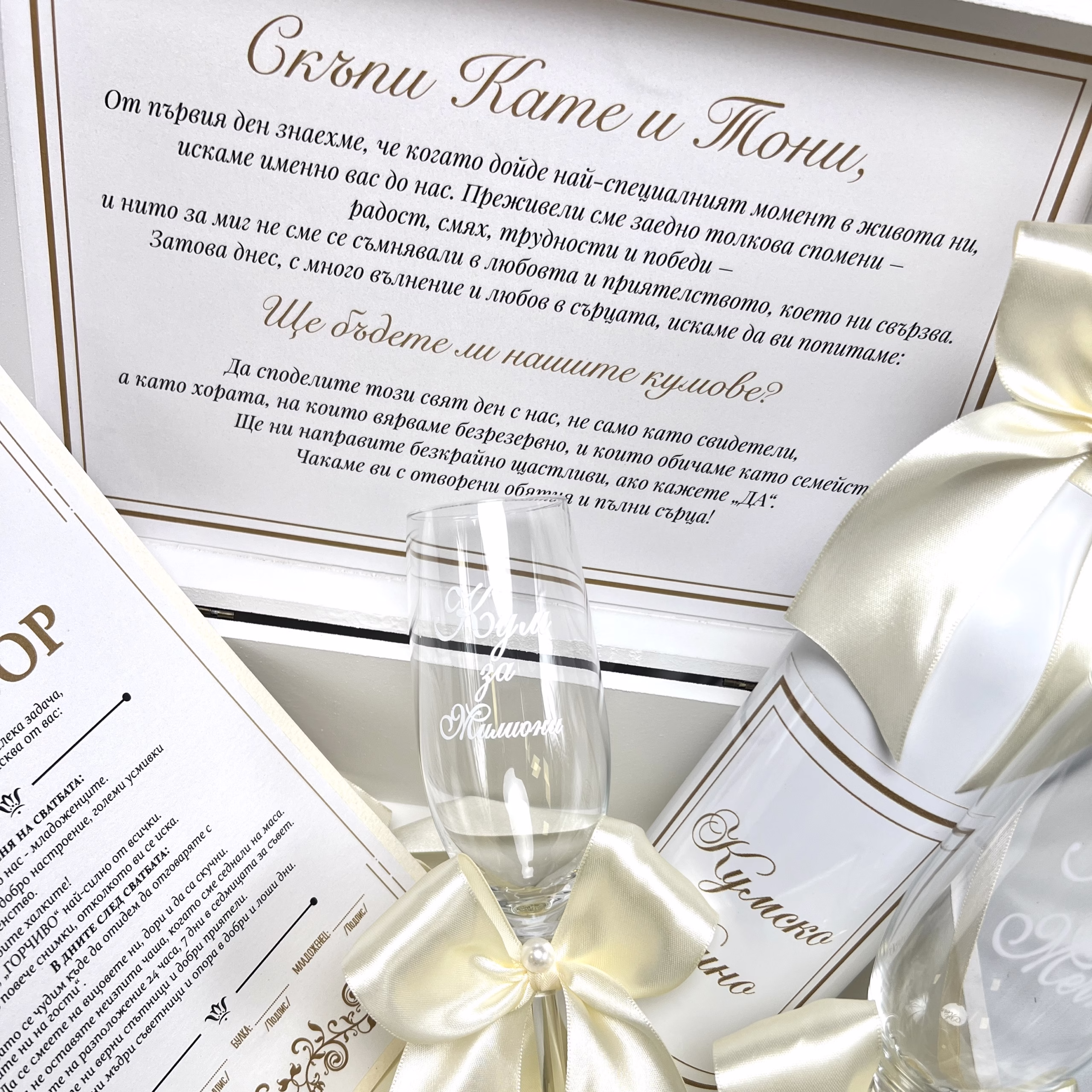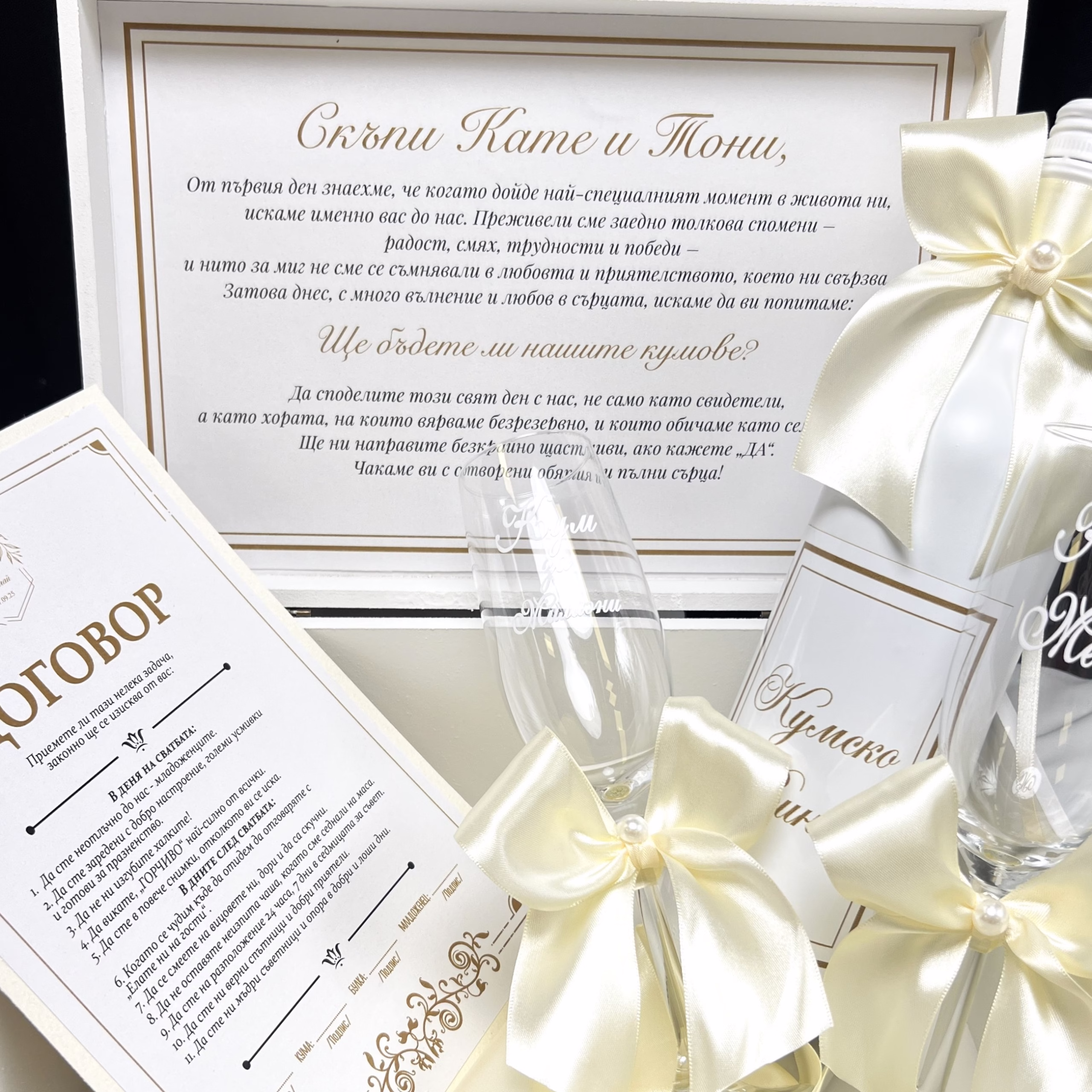 Луксозен подаръчен сет – покана кутия за кумове с перли, създаден да превърне поканата в незабравим емоционален момент. Комплектът включва бутилка вино с персонализиран етикет за кумовете, две стъклени чаши с персонализиран надпис от златно огледално фолио и договор за кумове с правила за вашите бъдещи отношения. Завършен с айвъри сатенени панделки с перлен акцент, сетът е идеалната изненада и стилен спомен, който ще остане дълго след сватбения ден.